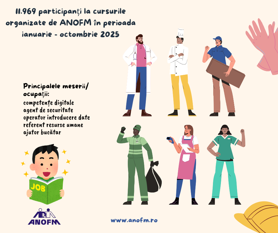 În perioada ianuarie – octombrie 2025, Agenţia Naţională pentru Ocuparea Forţei de Muncă (ANOFM) a cuprins în programele de formare profesională organizate prin intermediul centrelor regionale de formare profesională a adulţilor și centrelor proprii din cadrul agenţiilor teritoriale pentru ocuparea forţei de muncă 11.969 de persoane.