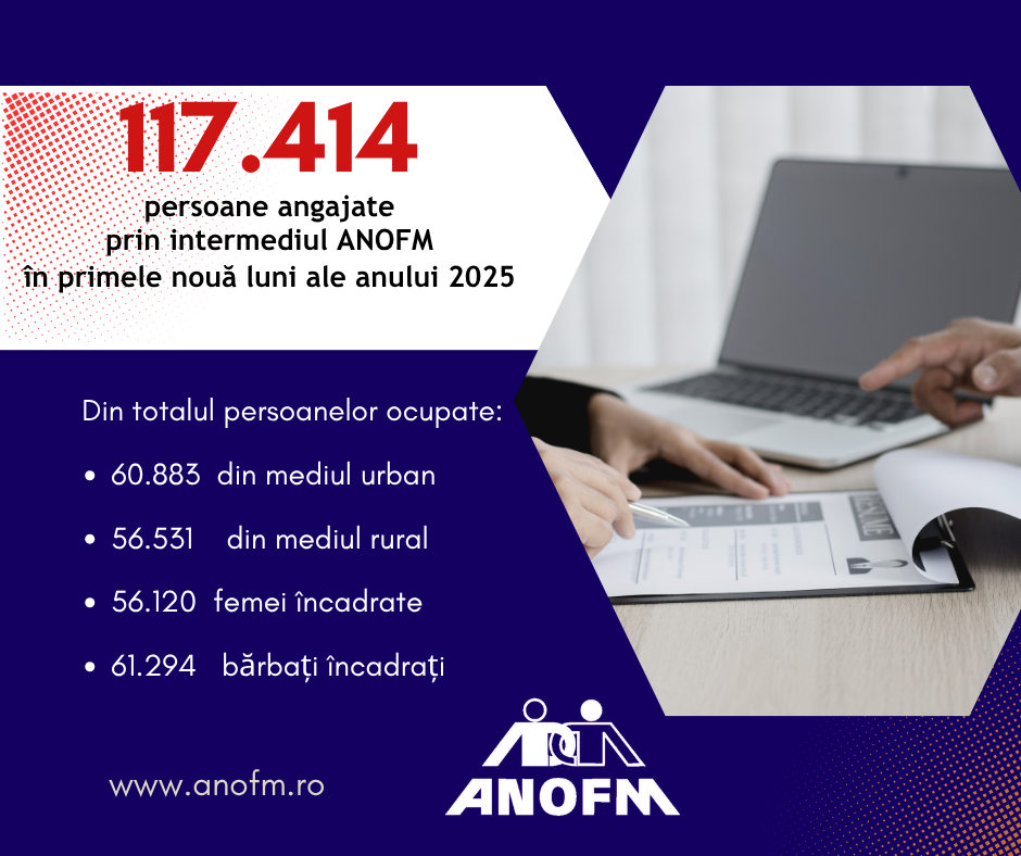 Ca urmare a implementării Programului Naţional de Ocupare a Forţei de Muncă de către agențiile pentru ocuparea forței de muncă județene și a municipiului București, în primele nouă luni ale anului 2025, au fost încadrate în muncă 117.414 persoane.