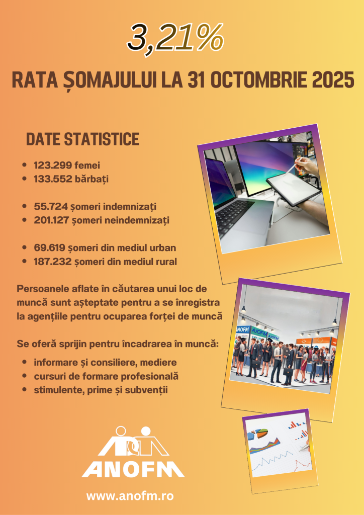 La sfârşitul lunii octombrie 2025, rata şomajului înregistrat la nivel naţional a fost de 3,21%, numărul total al șomerilor înregistrați a fost de 256.851 de persoane.