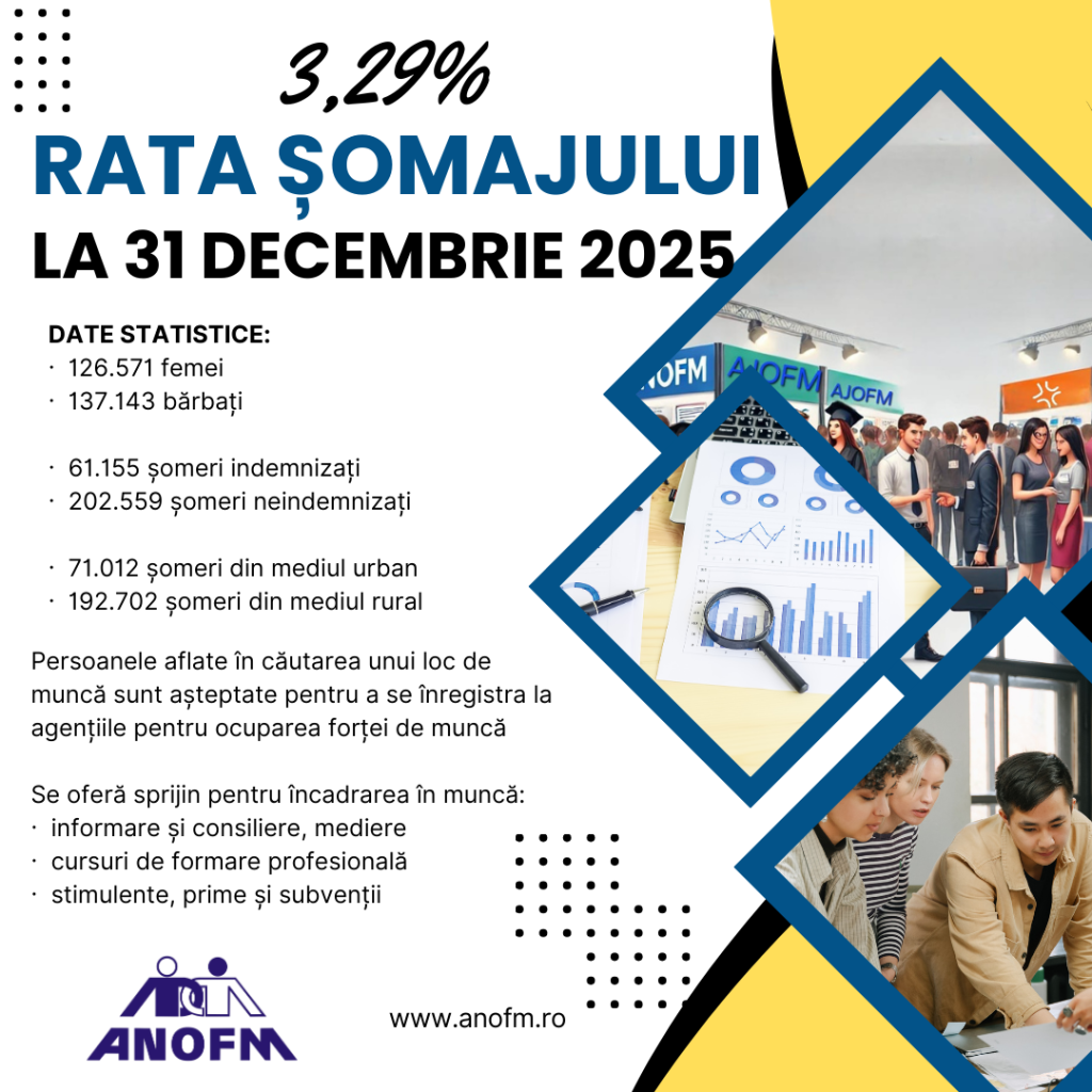 La sfârşitul lunii decembrie 2025, rata şomajului înregistrat la nivel naţional a fost de 3,29%, numărul total al șomerilor înregistrați a fost de 263.714 de persoane.