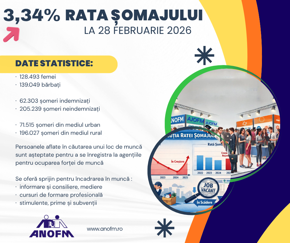 La sfârşitul lunii februarie 2026, rata şomajului înregistrat la nivel naţional a fost de 3,34%, numărul total al șomerilor înregistrați a fost de 267.542 de persoane.