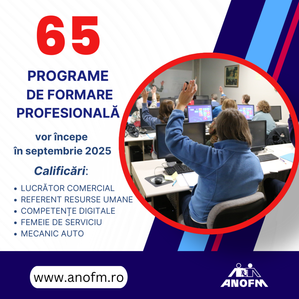Agenția Națională pentru Ocuparea Forței de Muncă va organiza în luna septembrie 2025, 65 programe de formare profesională pentru un număr de 983 persoane care beneficiază, conform legii, de servicii de formare profesională gratuite, organizate de agenţiile județene pentru ocuparea forţei de muncă şi a municipiului București.