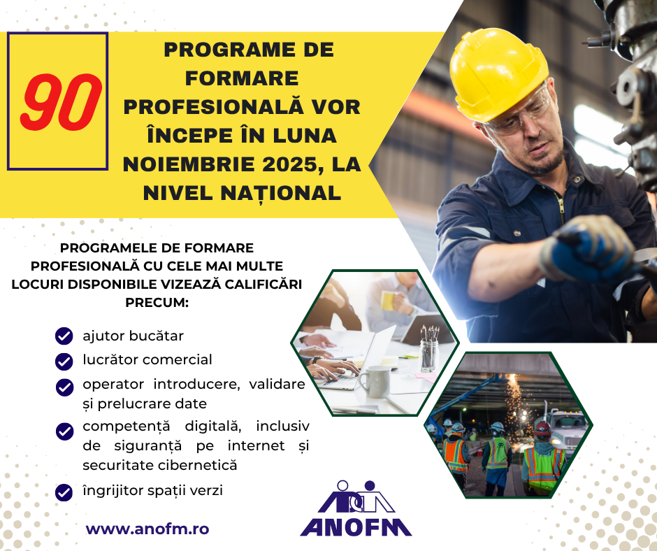 Agenția Națională pentru Ocuparea Forței de Muncă va organiza în luna noiembrie 2025, 90 programe de formare profesională pentru un număr de 1.347 persoane care beneficiază, conform legii, de servicii de formare profesională gratuite, organizate de agenţiile județene pentru ocuparea forţei de muncă şi a municipiului București.