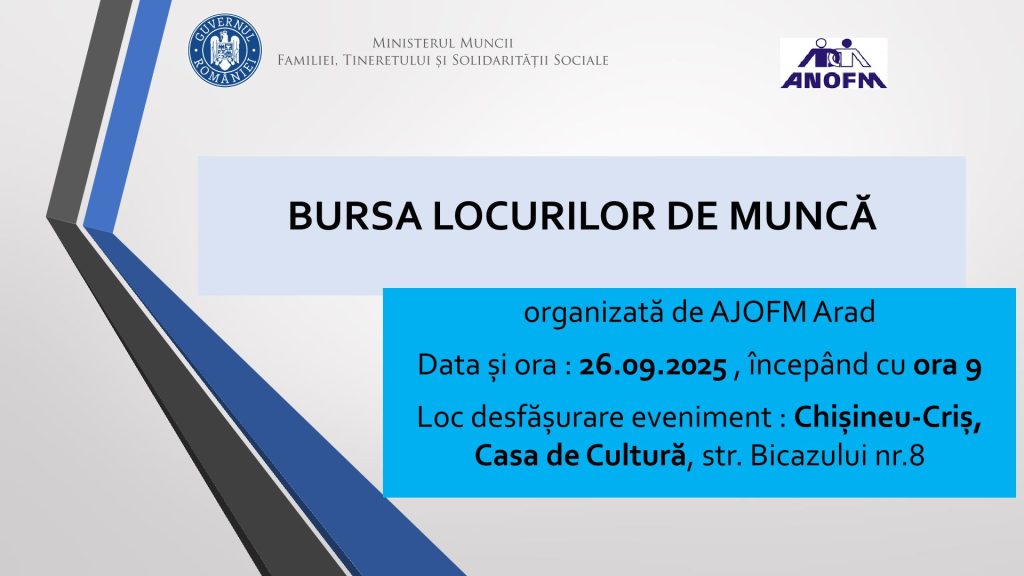 AGENŢIA JUDEŢEANĂ PENTRU OCUPAREA FORŢEI DE MUNCĂ ARAD organizează “ Bursa locurilor de muncă”, la Casa de Cultură CHIȘINEU-CRIȘ, str. Bicazului, nr.8, în data de 26.09.2025 cu începere de la ora 9 :00.