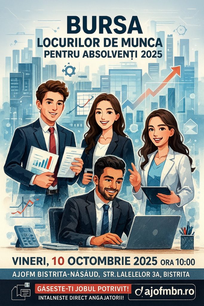 Vineri, 10 octombrie 2025, începând cu ora 10.00 la sediul Agenţiei Judeţene pentru Ocuparea Forţei de Muncă Bistriţa – Năsăud, din Bistriţa se va desfăşura “Bursa Locurilor de Muncă pentru Absolvenţi”.