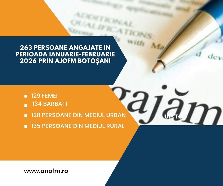 În perioada ianuarie-februarie 2026, au fost integrate pe piața muncii datorită măsurilor de stimulare a ocupării forței de muncă implementate de Agenția Județeană pentru Ocuparea Forței de Muncă Botoșani un număr total de 263 persoane.