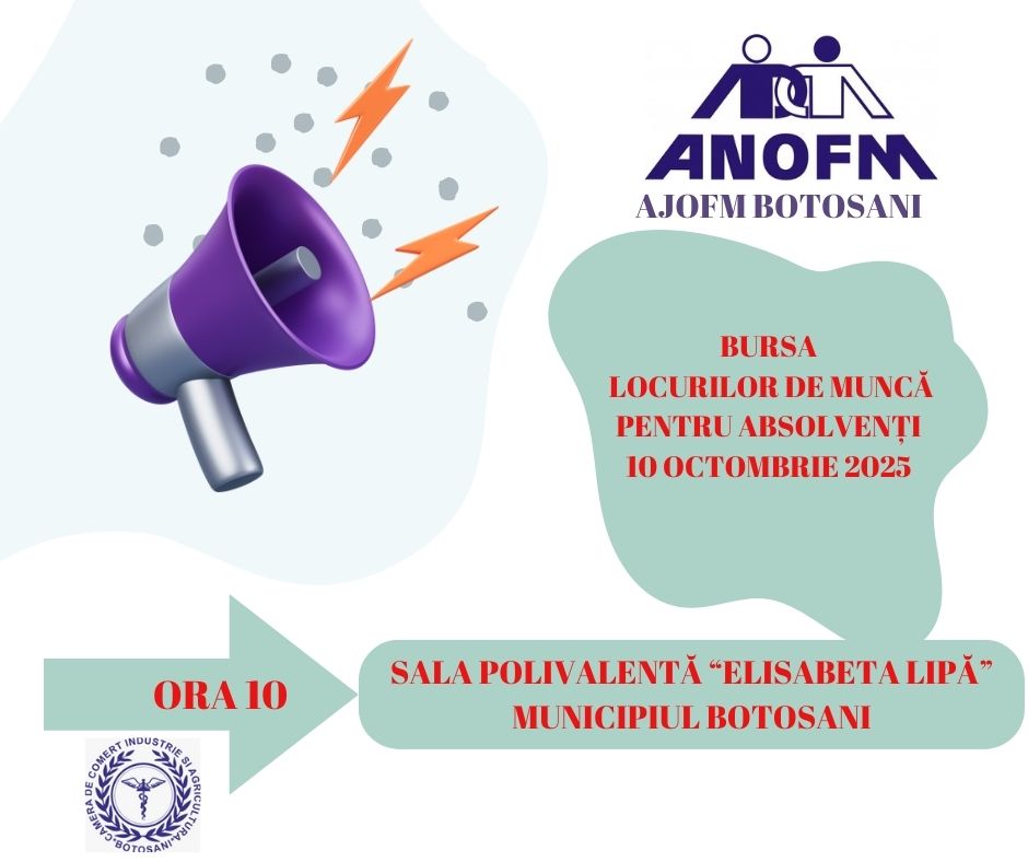Agentia Judeteană pentru Ocuparea Forţei de Muncă Botoșani va organiza Bursa locurilor de muncă pentru absolvenți din acest an, în data de 10 octombrie 2025, începând cu ora 10.00 în incinta Sălii Polivalente „Elisabeta Lipa” din Municipiul Botoșani.