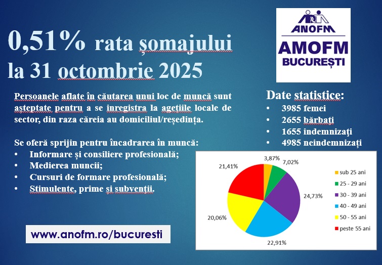 La sfârșitul lunii octombrie, în evidențele Agenției Municipale pentru Ocuparea Forței de Muncă Bucureşti erau înregistrați 6640 șomeri, rata șomajului fiind de 0,51%.