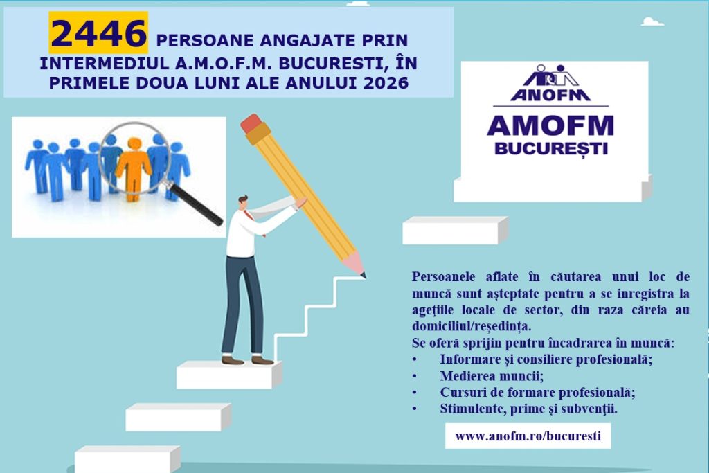 Ca urmare a implementării Programului Naţional de Ocupare a Forţei de Muncă, prin intermediul AMOFM Bucureşti, în perioada 01.01-28.02.2026 au fost încadrate 2446 persoane.