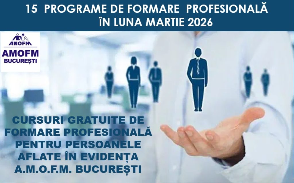 Agenția Municipală pentru Ocuparea Forței de Muncă București organizează, în luna martie 2026, cursuri gratuite de formare profesională destinate persoanelor aflate în evidența agenției și interesate să dobândească competențe noi sau să se recalifice pentru integrarea pe piața muncii.