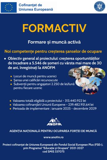 Agenția Municipală pentru Ocuparea Forței de Muncă București implementează în perioada 24 decembrie 2024 – 23 decembrie 2029, proiectul „FORMACTIV – Formare și muncă activă”, cod proiect 337075. Obiectivul general al proiectului