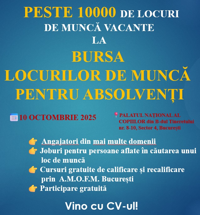 Agenția Municipală pentru Ocuparea Forței de Muncă București va organiza vineri, 10 octombrie 2025, începând cu ora 09:00, o nouă ediție a „Bursei locurilor de muncă pentru absolvenţi”. Evenimentul va avea loc la Palatul Național al Copiilor, din Bulevardul Tineretului nr. 8-10, Sector 4, București.