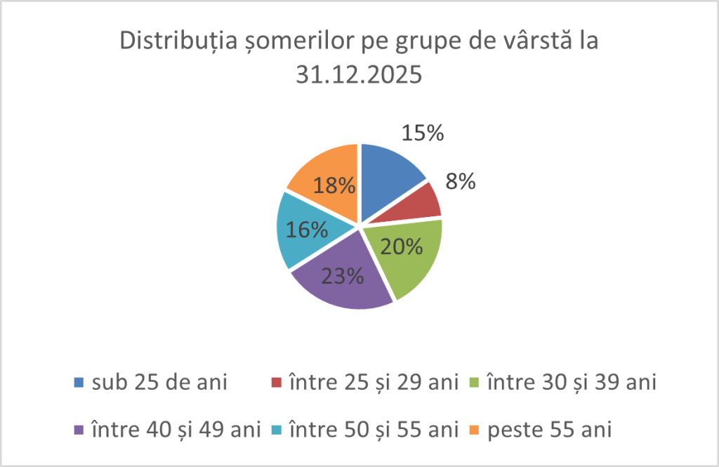 Cei mai mulți șomeri la sfârșitul lunii decembrie 2025, aveau vârsta cuprinsă între 40-49 ani (1462), urmați de cei cu vârsta între 30-39 ani (1243), cei cu vârsta peste 55 ani (1116), apoi urmați de cei cu vârsta între 50-55 ani (1035), urmați de cei cu vârsta de sub 25 ani (980), cei mai puțini șomeri fiind persoanele cu vârsta cuprinsă între 25-29 ani (492).
