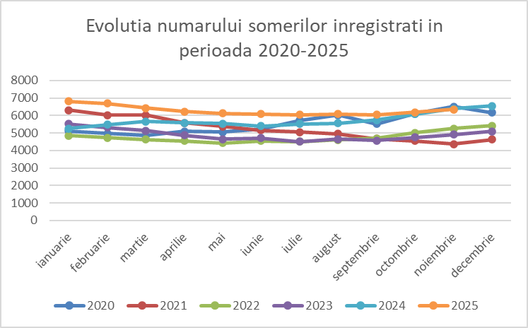 În graficul următor este prezentată evoluţia numărului şomerilor înregistraţi în ultimii 5 ani (2020-2025):