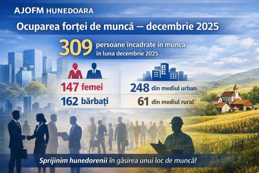 309 persoane şi-au găsit un loc de muncă, în cursul lunii decembrie 2025, cu sprijinul AJOFM Hunedoara
