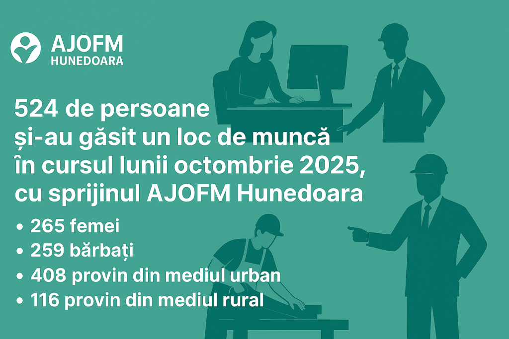 524 persoane şi-au găsit un loc de muncă cu sprijinul AJOFM HUNEDOARA, în cursul lunii octombrie 2025 24/11/2025 Comunicate de presă Documente descărcabile Comunicat-de-presa-ocupare-octombrie-2025-AJOFM-Hunedoara.pdf Distribuie facebook X linkedin email