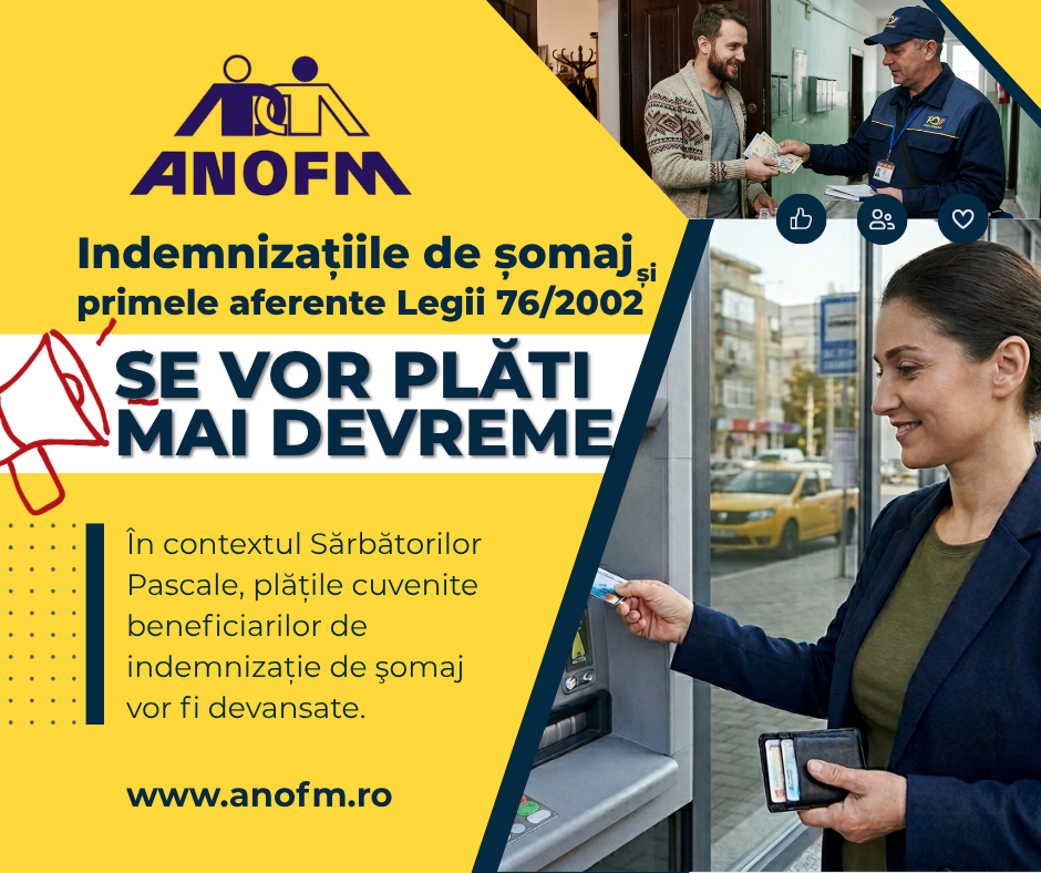 Agenţia Naţională pentru Ocuparea Forţei de Muncă (ANOFM) anunță că, în contextul Sărbătorilor Pascale, calendarul de plată privind indemnizațiile de șomaj și primele acordate în baza Legii nr. 76/2002, a fost modificat. Astfel, toți beneficiarii înregistrați vor primi indemnizațiile de șomaj și primele înainte de data de 10 aprilie 2026.