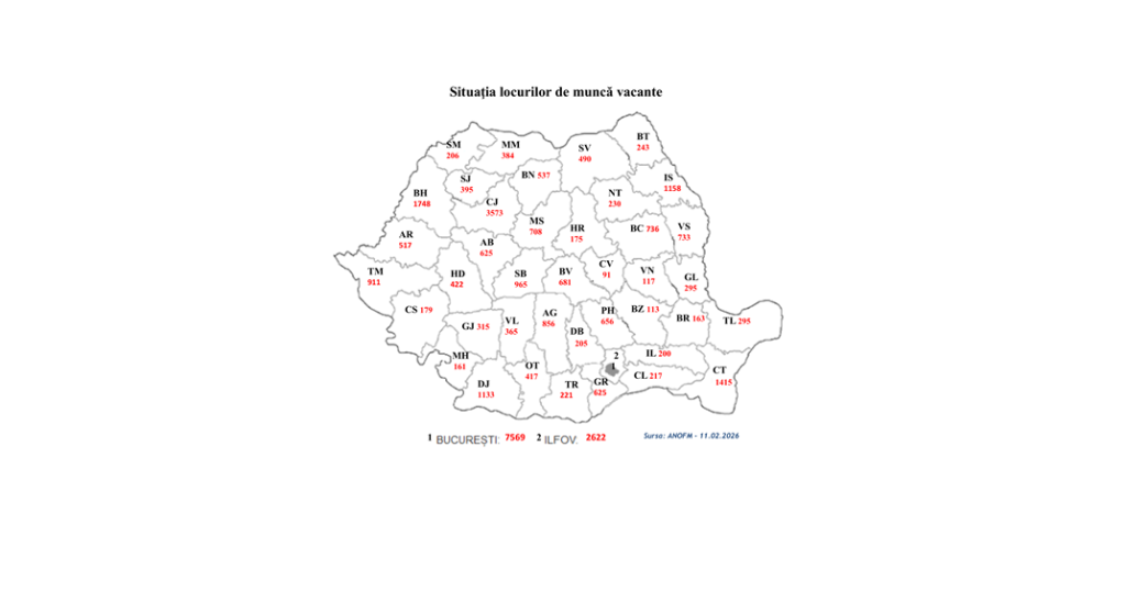 Potrivit datelor furnizate de agenţii economici privind locurile de muncă vacante, în evidenţele Agenţiei Naţionale pentru Ocuparea Forţei de Muncă (ANOFM), sunt disponibile 33.667 locuri de muncă la nivel naţional. De asemenea, angajatorii din Spaţiul Economic European oferă, prin intermediul reţelei EURES România, 242 locuri de muncă vacante.