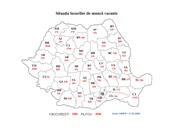 Potrivit datelor furnizate de agenţii economici privind locurile de muncă vacante, în evidenţele Agenţiei Naţionale pentru Ocuparea Forţei de Muncă (ANOFM), sunt disponibile 33.195 locuri de muncă la nivel naţional. De asemenea, angajatorii din Spaţiul Economic European oferă, prin intermediul reţelei EURES România, 119 locuri de muncă vacante.