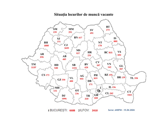 Potrivit datelor furnizate de agenţii economici privind locurile de muncă vacante, în evidenţele Agenţiei Naţionale pentru Ocuparea Forţei de Muncă (ANOFM), sunt disponibile 32.624 locuri de muncă la nivel naţional. De asemenea, angajatorii din Spaţiul Economic European oferă, prin intermediul reţelei EURES România, 179 locuri de muncă vacante.