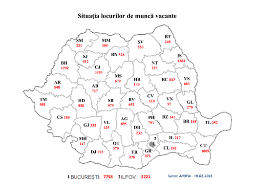 Potrivit datelor furnizate de agenţii economici privind locurile de muncă vacante, în evidenţele Agenţiei Naţionale pentru Ocuparea Forţei de Muncă (ANOFM), sunt disponibile 32.926 locuri de muncă la nivel naţional. De asemenea, angajatorii din Spaţiul Economic European oferă, prin intermediul reţelei EURES România, 232 locuri de muncă vacante.