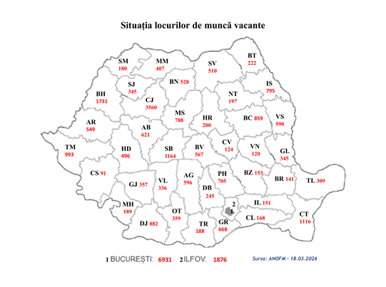 Potrivit datelor furnizate de agenţii economici privind locurile de muncă vacante, în evidenţele Agenţiei Naţionale pentru Ocuparea Forţei de Muncă (ANOFM), sunt disponibile 31.352 locuri de muncă la nivel naţional. De asemenea, angajatorii din Spaţiul Economic European oferă, prin intermediul reţelei EURES România, 131 locuri de muncă vacante.