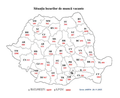 Potrivit datelor furnizate de agenţii economici privind locurile de muncă vacante, în evidenţele Agenţiei Naţionale pentru Ocuparea Forţei de Muncă (ANOFM), sunt disponibile 30.713 locuri de muncă la nivel naţional. De asemenea, angajatorii din Spaţiul Economic European oferă, prin intermediul reţelei EURES România, 434 locuri de muncă vacante.