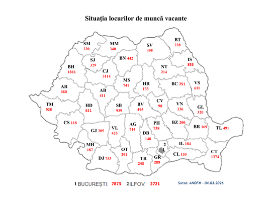 Potrivit datelor furnizate de agenţii economici privind locurile de muncă vacante, în evidenţele Agenţiei Naţionale pentru Ocuparea Forţei de Muncă (ANOFM), sunt disponibile 32.056 locuri de muncă la nivel naţional. De asemenea, angajatorii din Spaţiul Economic European oferă, prin intermediul reţelei EURES România, 121 locuri de muncă vacante.