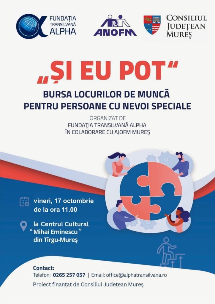 Agenția Județeană pentru Ocuparea Forței de Muncă Mureș, anunță organizarea, în colaborare cu Fundația Alpha Transilvană, a unei burse a locurilor de muncă pentru persoane cu dizabilități, în data de 17.10.2025 începând de la ora 11, la Centrul Cultural Mihai Eminescu din Tg. Mureș, str. Nicolae Grigorescu, nr. 19.