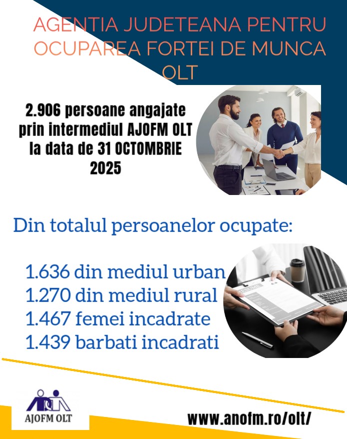 2.906 persoane incadrate prin intermediul AJOFM Olt, în primele zece luni ale anului 2025 26/11/2025 Ultimele noutăți (slider) 2.906 persoane incadrate prin intermediul AJOFM Olt, în primele zece luni ale anului 2025Descarcă Distribuie facebook X linkedin email