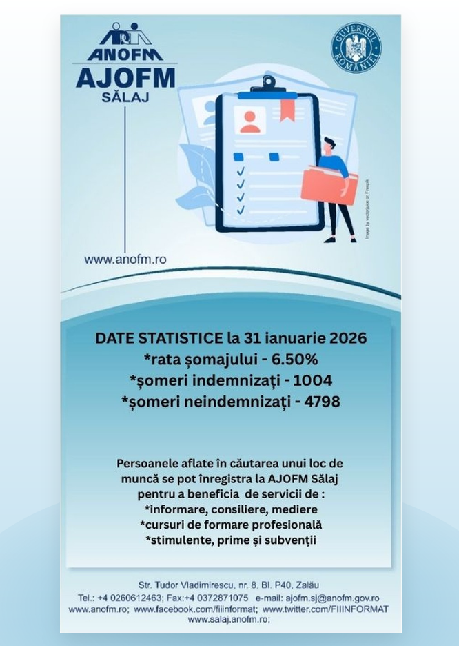 La sfârșitul lunii ianuarie 2026, rata șomajului înregistrat la nivelul județului Sălaj a fost de 6.50 la sută, mai mare cu 0.11pp decât cea înregistrată la finalul anului 2025 și cu 0.24pp mai mare decât rata înregistrată la finalul lunii ianuarie a anului 2025.