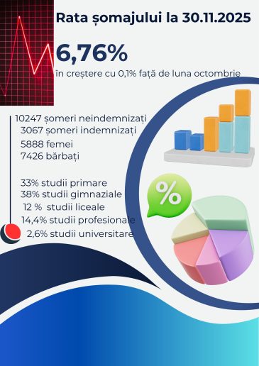 În primele 11 luni ale anului 2025, în evidența AJOFM Suceava s-au înregistrat 13314 persoane, din care 3067 sunt beneficiare de indemnizație de șomaj, 5888 sunt de gen feminin, iar