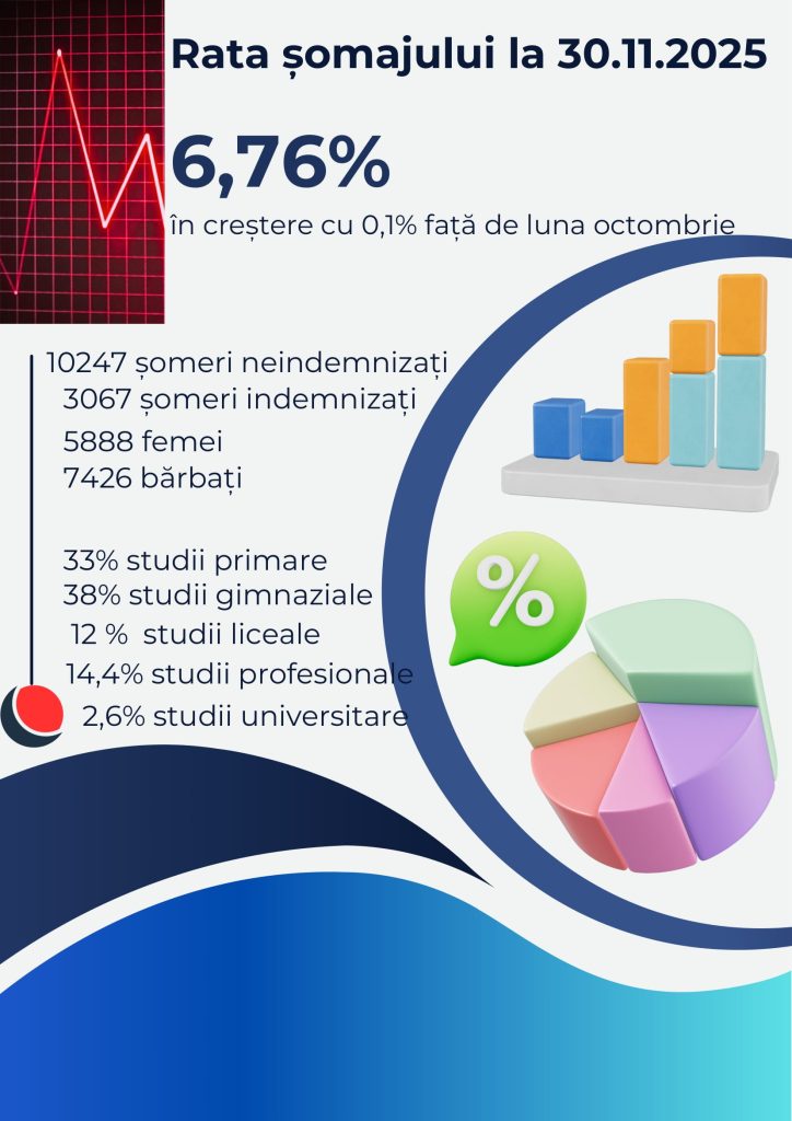 În primele 11 luni ale anului 2025, în evidența AJOFM Suceava s-au înregistrat 13314 persoane, din care 3067 sunt beneficiare de indemnizație de șomaj, 5888 sunt de gen feminin, iar 7426 sunt de gen masculin.