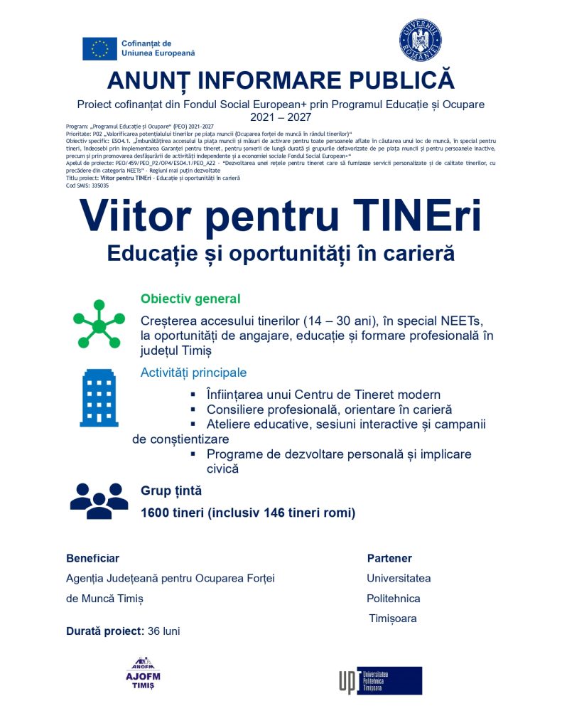 Conținutul acestui material nu reprezintă în mod obligatoriu poziția oficială a Uniunii Europene sau a Guvernului României. Pentru informații detaliate despre celelalte programe cofinanțate de Uniunea Europeană, va invităm să vizitați fonduri-ue.ro. Realizat în cadrul proiectului „Relația SPO cu angajatorii – eSPOR”/ POCU/801/3/15/139164 – cofinanțat prin Fondul Social European, Programul Operațional Capital Uman 2014 – 2020, Axa prioritară 3 – Locuri de muncă pentru toți.